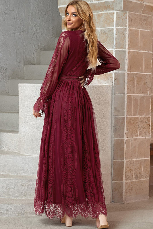 Scalloped Hem Flounce Sleeve Lace V-Neck Maxi Dress
